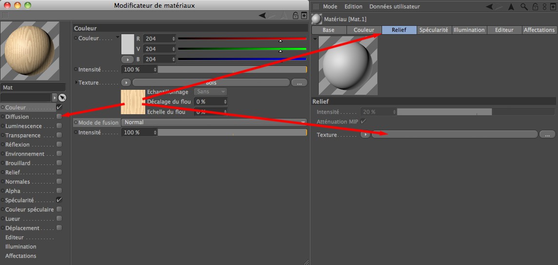 Il est très simple de copier des textures (des images bitmap/des matières) entre plusieurs matériaux et/ou canaux en déposant leur vignette d'aperçu sur l'une des cibles (voir image ci-dessus).