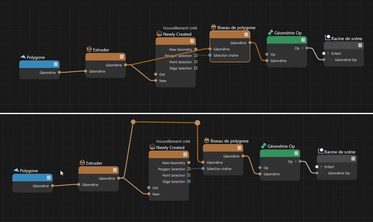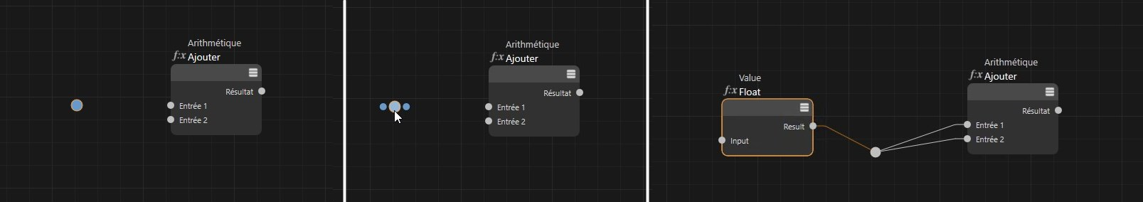 Lorsque vous survolez les points de routeurs avec la souris, des ports latéraux apparaissent, que vous pouvez utiliser pour créer de nouvelles connexions. Cela permet également de diviser une connexion afin de transmettre sa valeur à plusieurs nœuds ou ports. L'image suivante l'illustre à titre d'exemple.