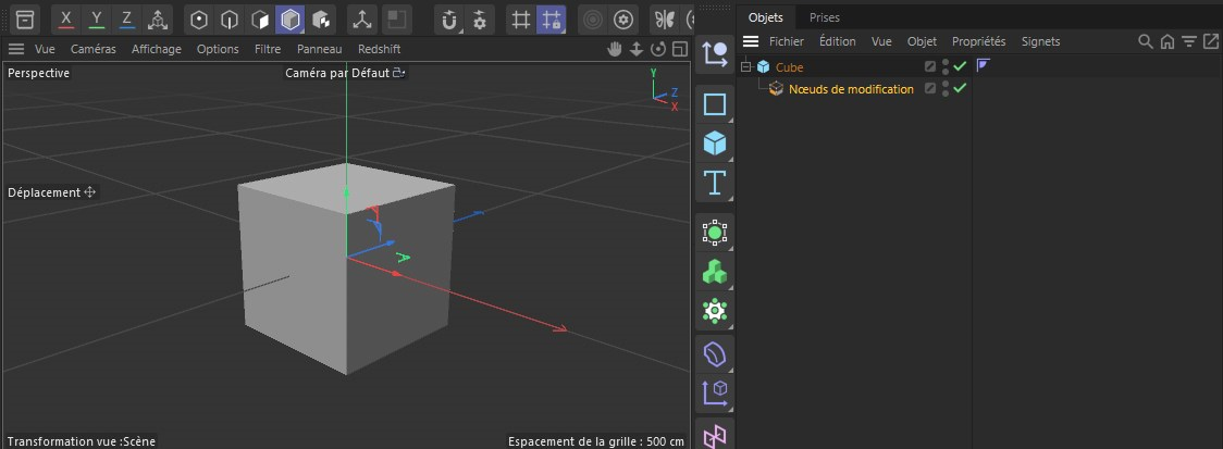 Commençons par la première étape, à savoir l'appel d'un groupe de modificateurs de nœuds à partir des nœuds de construction de ressources dans le navigateur de ressources. À partir de là, faites glisser Nœuds de modification directement dans le gestionnaire d'objets. Là, cette entrée fonctionne alors comme un déformateur, elle doit donc être subordonnée aux objets. Par conséquent, créez directement une simple primitive, tel qu'un cube, et attribuez-lui directement le modificateur de nœud. Comme il n'a pas encore été rempli de fonctions, rien ne changera dans le cube pour l'instant.