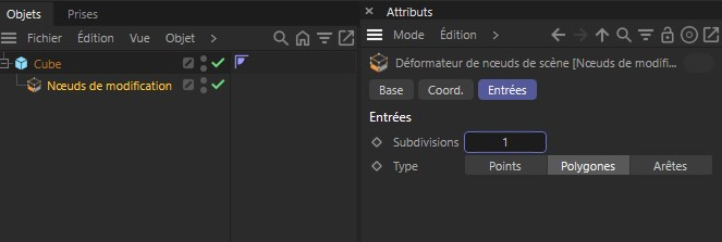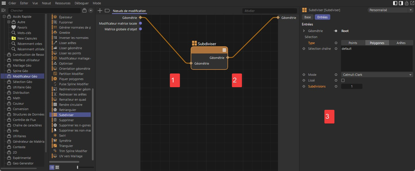 Dans notre cas, le cube sera subdivisé. Le type de sélections à évaluer (points, arêtes ou polygones) ou la fréquence à laquelle l'objet doit être subdivisé, par exemple, peuvent être définis après avoir sélectionné le nœud Subdiviser dans le gestionnaire d'attributs (voir le numéro 3 dans l'image ci-dessus).