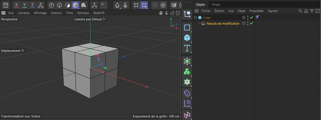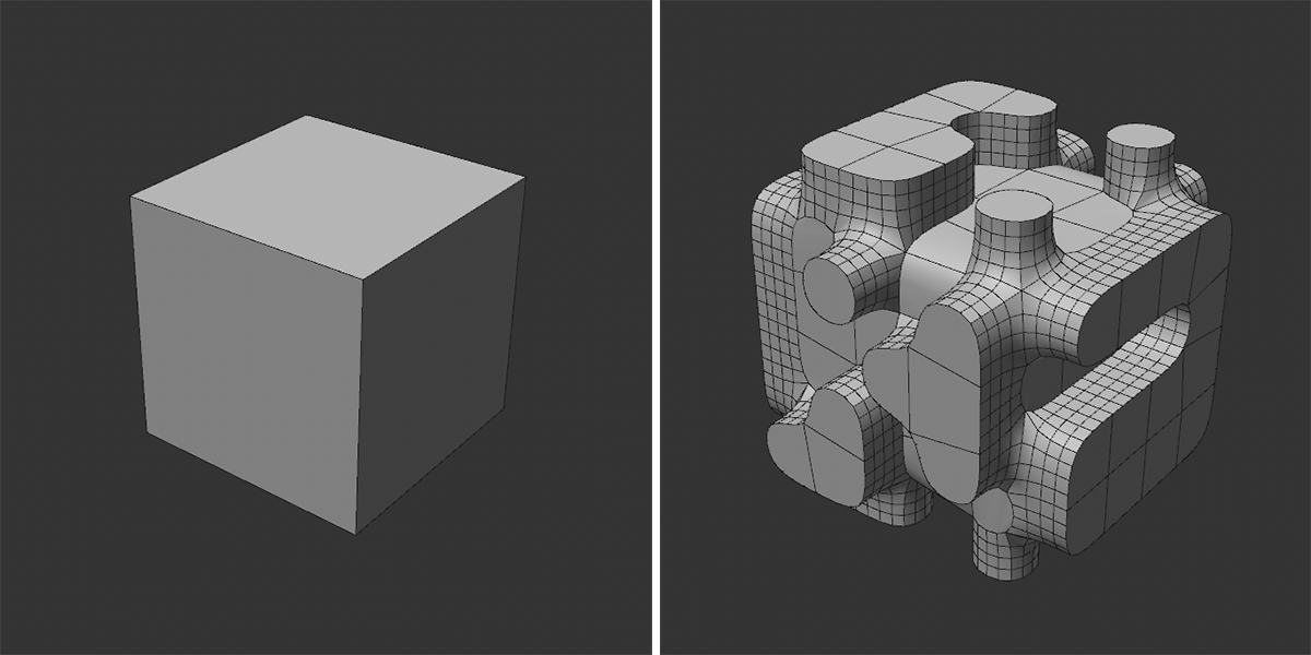 Le cube modifié après l'ajout du nœud Subdiviser au groupe de modificateurs Nœuds.