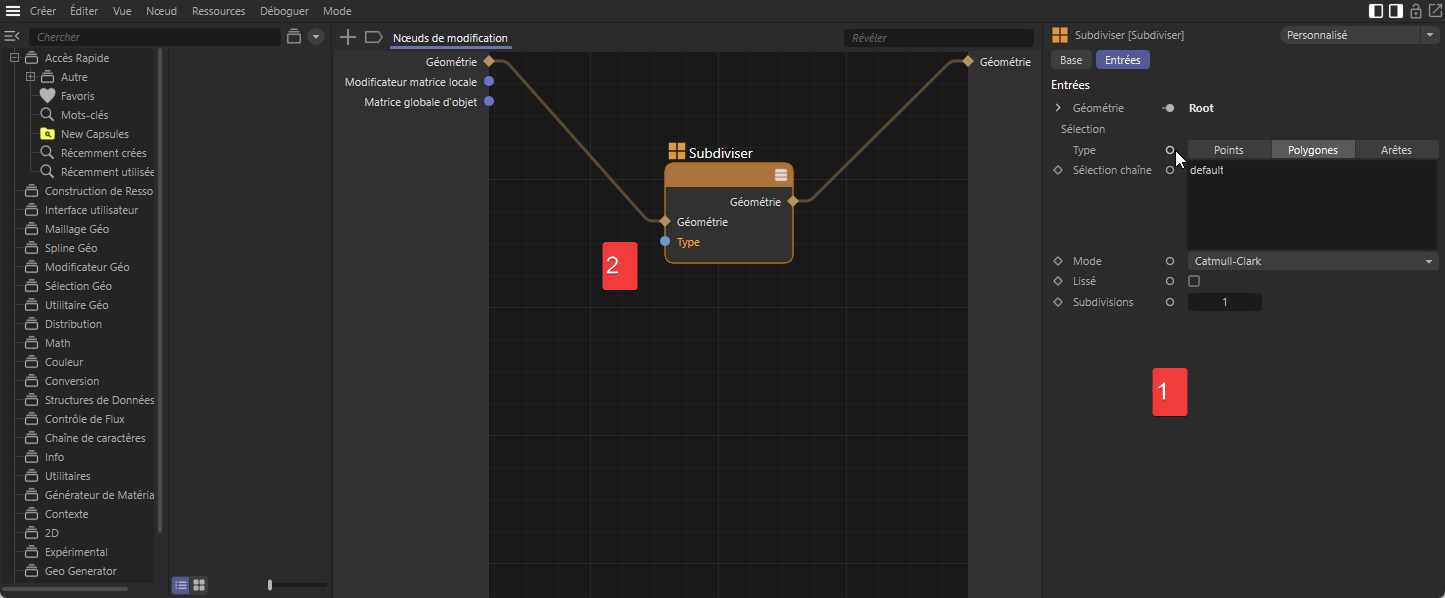 Comme pour la connexion du paramètre Type, nous avons à nouveau besoin d'une entrée appropriée au nœud Subdiviser, cette fois pour le nombre de subdivisions. Pour ce faire, sélectionnez le nœud et faites Ctrl+clic sur l'icône de cercle à côté de la valeur Subdivisions dans le gestionnaire d'attributs (voir numéro 1 dans l'image suivante). L'entrée correspondante sur le nœud apparaît (voir numéro 2).