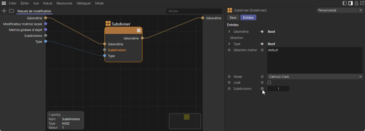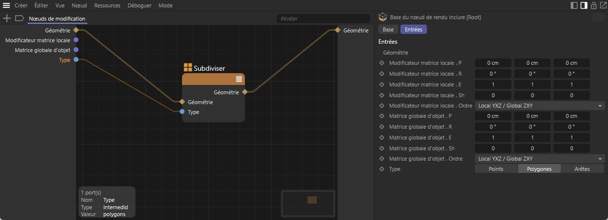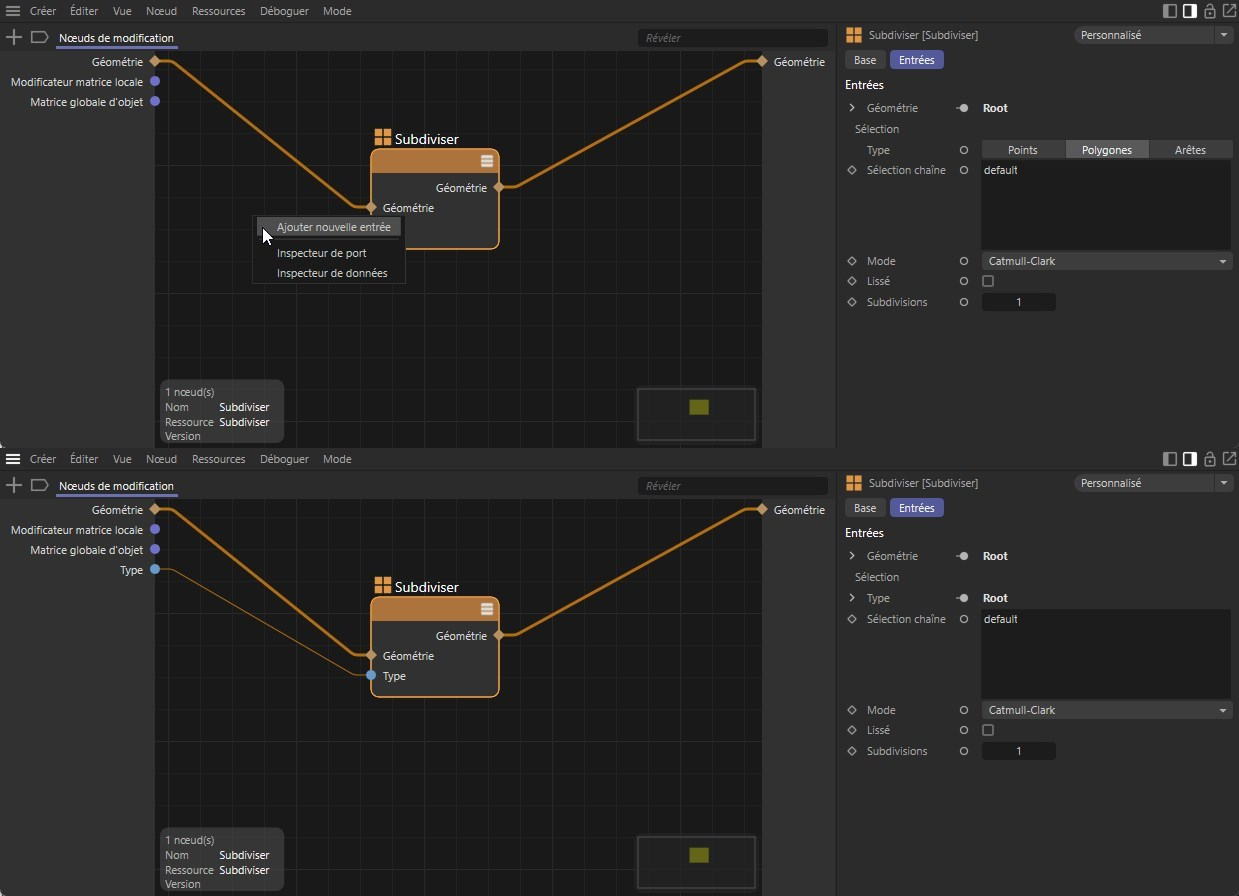 Les nœuds, comme le nœud Subdiviser dans notre cas, fournissent de nombreux paramètres dans le gestionnaire d'attributs, dont certains peuvent également intéresser les utilisateurs du groupe de modificateurs Nœuds. Le seul inconvénient est que vous devez toujours sélectionner le nœud correspondant dans l'éditeur de nœuds avant de pouvoir modifier ses paramètres dans le gestionnaire d'attributs. Il existe une solution à ce problème, car tous les paramètres peuvent également être créés en tant que ports d'entrée sur les nœuds, puis liés à la page d'entrée du groupe. Nous le ferons d'abord pour le paramètre Type du nœud de sélection, afin que l'utilisateur puisse sélectionner ultérieurement les éléments sélectionnés (points, arêtes ou polygones) à utiliser pour contraindre la fonction Subdiviser.