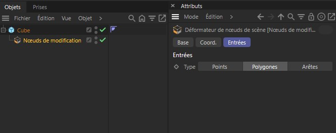 Vérifions-le directement. Sélectionnez le groupe de Nœuds de modification dans le gestionnaire d'objets et consultez l'onglet Entrées dans le gestionnaire d'attributs. Vous devriez alors être en mesure de voir et d'utiliser directement l'option Type (voir l'image ci-dessous).