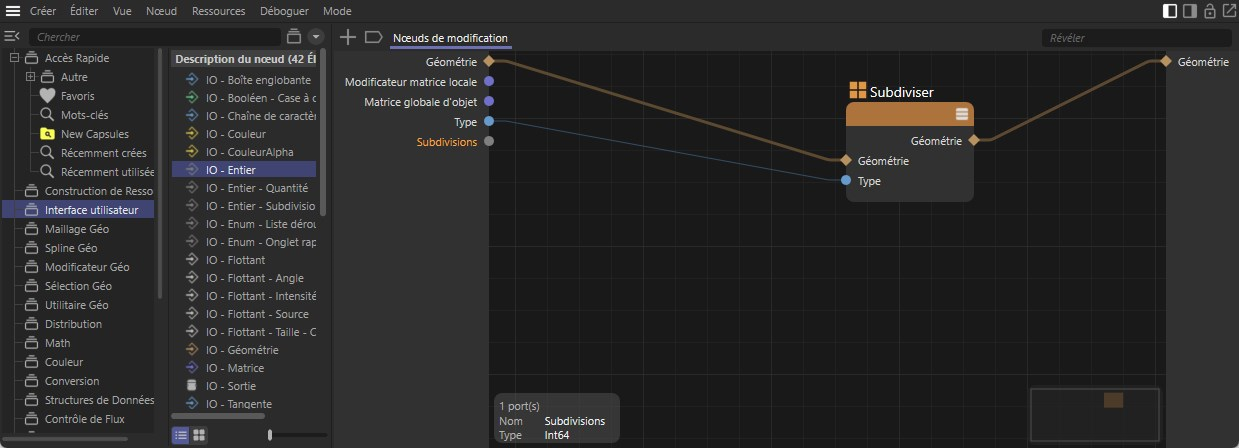 Dans notre exemple, le nombre de subdivisions devrait ainsi pouvoir être contrôlé par le nœud Subdiviser. Comme il s'agit d'une valeur entière, seul le contrôle Entier peut être utilisé. Dans les entrées des éléments de l'interface utilisateur duNavigateur de ressources, vous trouverez ces entrées :