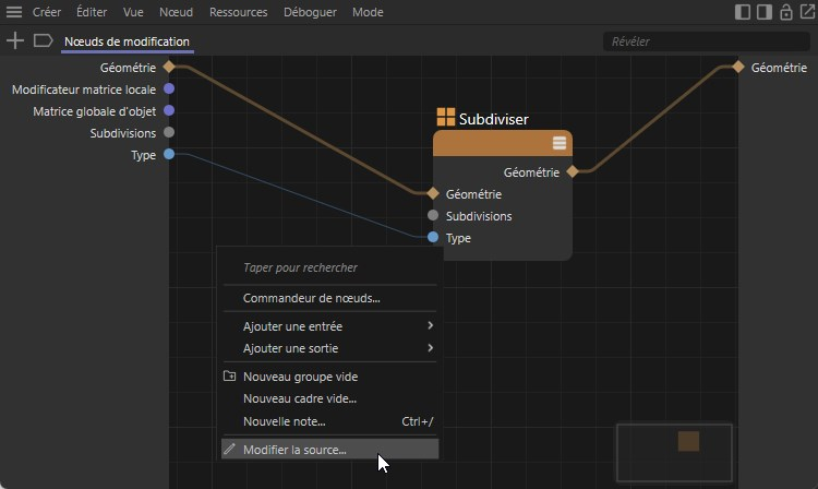 Pour transformer notre groupe de Nœuds de modification en une ressource fonctionnelle, il suffit d'ajouter un seul nœud capable de gérer la géométrie. Vous trouverez un grand nombre de ces nœuds dans le groupe Modificateur de géométrie du navigateur de ressources. Nous sélectionnons le nœud Subdiviser et le faisons glisser du navigateur de ressources directement dans l'éditeur de nœuds.
