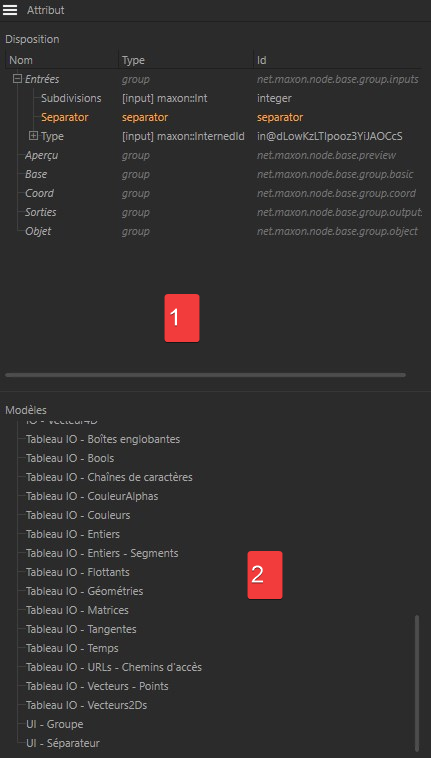 L'ordre des entrées dans le groupe Entrées reflète automatiquement l'ordre des paramètres dans le gestionnaire d'attributs. Vous pouvez à présent procéder à un nouveau tri harmonieux. En outre, il est plus facile ici de faire glisser les éléments à arranger, UI - Groupe et UI - Séparateur de la liste inférieure directement aux endroits souhaités dans la hiérarchie supérieure. Cela permet ensuite d'inclure des sous-catégories(UI - Groupe) et de simples séparateurs(UI - Séparateur) pour structurer des listes de paramètres plus étendues.