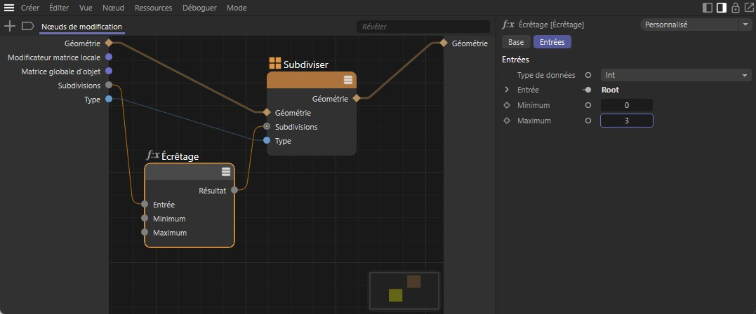 Le premier nœud qui s'y prête est le nœud Écrêtage, que vous trouverez dans la catégorie Math du navigateur de ressources. Connectez son port d'entrée au port de subdivision de base du groupe une fois à titre de test, puis connectez la sortie de résultat du nœud Écrêtage à l'entrée de subdivision du nœud de subdivision. Comme chaque port d'entrée ne peut avoir qu'une seule connexion, cette opération supprime automatiquement l'ancienne connexion. Sinon, vous pouvez également supprimer l'ancienne connexion en double-cliquant dessus avant de connecter le nœud Écrêtage.