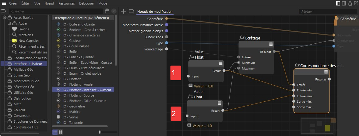 Dans de nombreux cas, il est utile de vérifier ou de convertir les valeurs saisies, par exemple pour ne pas autoriser des entrées trop élevées pour les subdivisions, ce qui pourrait entraîner des problèmes de mémoire. Dans d'autres cas également, par exemple lorsque des valeurs en pourcentage sont saisies via un IO Flottant - Intensité - Curseur, celles-ci peuvent être converties en d'autres valeurs numériques en vue d'un traitement ultérieur. Comme vous pouvez le lire dans la section ci-dessus, de telles limites pour l'entrée de valeurs peuvent être spécifiées directement dans l'éditeur de ressources pour chaque paramètre en attente d'une entrée numérique. Parfois, cependant, ces limites doivent être converties directement dans l'installation, par exemple pour certains calculs mathématiques. Par conséquent, dans cette section, nous verrons comment vous pouvez convertir des nombres ou les restreindre à la plage de valeurs souhaitée.