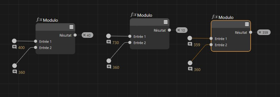 Comme le montre l'image ci-dessus, le Modulo a deux entrées. Au niveau de l'entrée inférieure, il faut toujours introduire la valeur maximale autorisée. Si vous souhaitez limiter les valeurs d'angle entre 0° et 360°, par exemple, entrez 360. Le Modulo fonctionne généralement avec une limite inférieure de 0, c'est-à-dire qu'il n'autorise que les valeurs comprises entre 0 et la valeur de l'entrée inférieure.