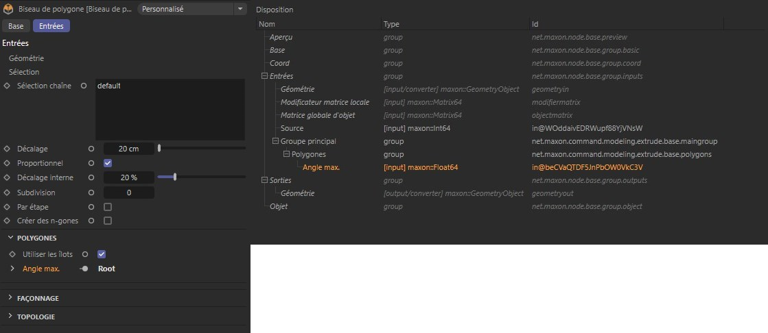 Ce type de données est spécifiquement destiné à l'échange d'informations relatives à la géométrie d'un objet. Il s'agit, par exemple, des positions des points d'une surface ou d'une spline, des paires de points connectés aux arêtes, des points qui délimitent les polygones ou des tangentes d'une spline. En raison de la complexité de ce type de données, aucun élément de contrôle n'est fourni. Au lieu de cela, vous devez utiliser les ports de géométrie des nœuds pour transmettre ou accepter des données sur ce port.