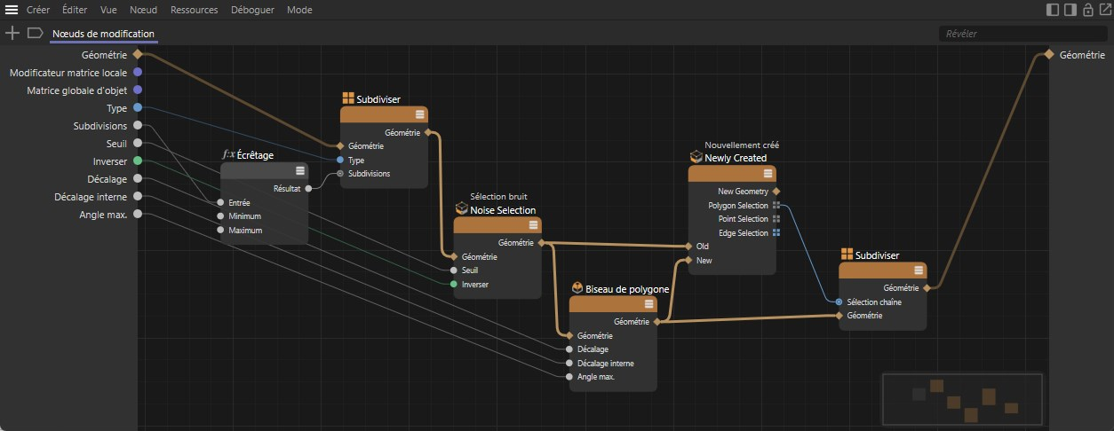 Avec quelques nœuds supplémentaires, nous pouvons maintenant compléter notre configuration et obtenir un résultat intéressant. Une sélection basé sur bruit crée une sélection aléatoire de polygones sur l'objet subdivisé. Pour ce faire, créez les options Seuil et Inverser en tant qu'entrées utilisateur dans le groupe.