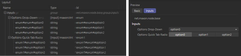 Ces éléments sont utiles lorsque vous souhaitez proposer aux utilisateurs un menu déroulant ou plusieurs modes sous forme de boutons. Par défaut, ces éléments ont chacun trois options de sélection, que vous pouvez renommer à votre guise dans l'éditeur de ressources. Les deux éléments IO renvoient des valeurs entières commençant à 0 pour le premier élément de la liste. Ces valeurs peuvent être converties en n'importe quelle autre valeur, par exemple avec un nœud Commutateur.