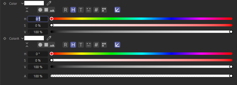 Deux éléments sont disponibles pour saisir et transmettre des informations sur les couleurs : IO - Couleur et IO - Couleur Alpha. Elles sont fondamentalement identiques, sauf que l'option IO - Couleur Alpha inclut un pourcentage supplémentaire pour déterminer l'opacité de la couleur. Les deux éléments fournissent des données vectorielles dont les composantes X, Y et Z représentent les composantes de couleur rouge, verte et bleue et sont stockées sous forme de valeurs à virgule flottante comprises entre 0,0 et 1,0. IO - Couleur Alpha comprend une composante alpha supplémentaire dont la valeur peut également être comprise entre 0,0 et 1,0. Les deux types de données peuvent être lus et traités comme Color ou ColorAlpha, ainsi que Vector3d ou Vector4d.