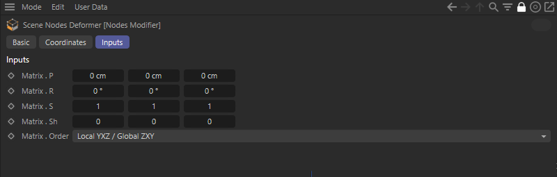 Une matrice est constituée de différents vecteurs permettant, entre autres, de définir la position, la taille et la rotation d'un système d'axes ou d'un objet dans l'espace. Ce contrôle est donc identique à la section Coordonnées pour les objets.