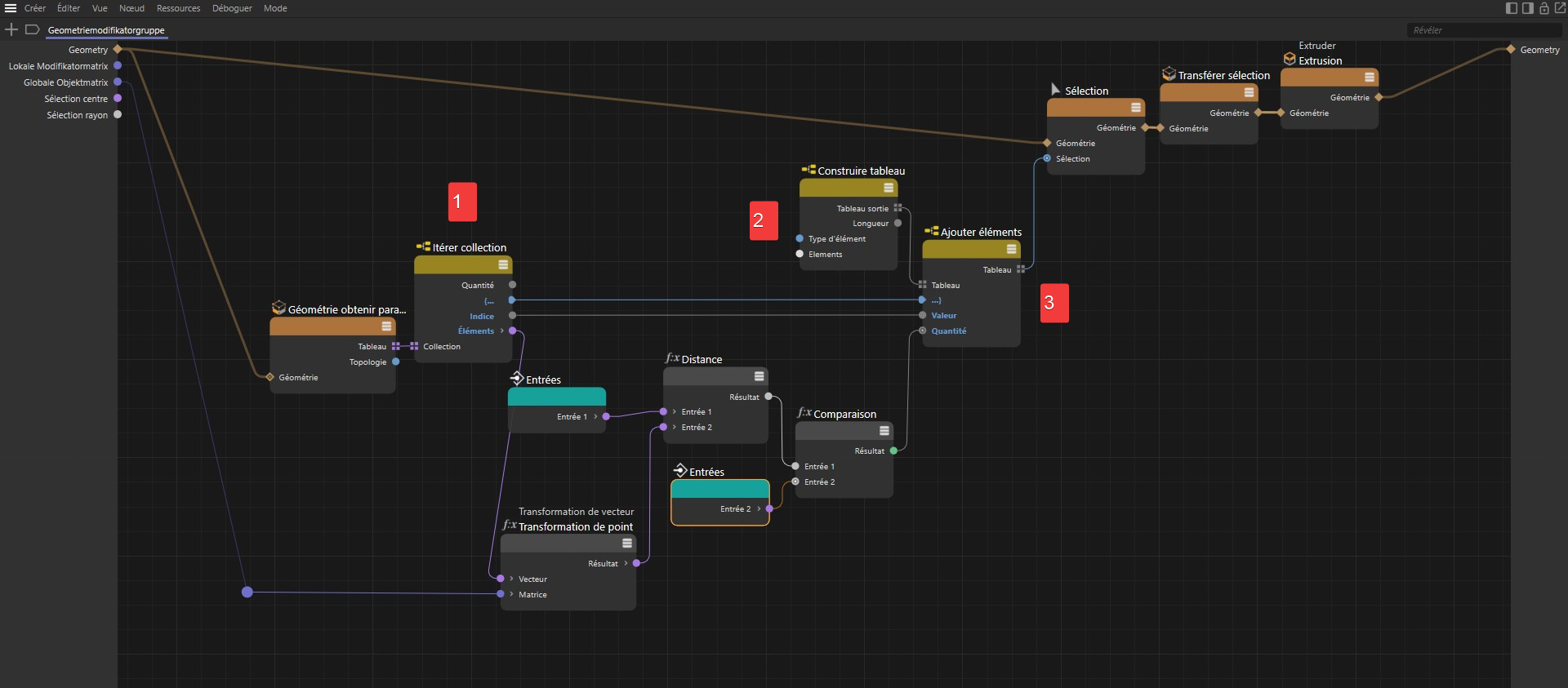 Par ailleurs, vous pouvez également utiliser le Nœuds de sélection selon le même principe, sauf qu'il est principalement utilisé pour manipuler ou créer des sélections de points, d'arêtes ou de polygones sur l'objet parent.