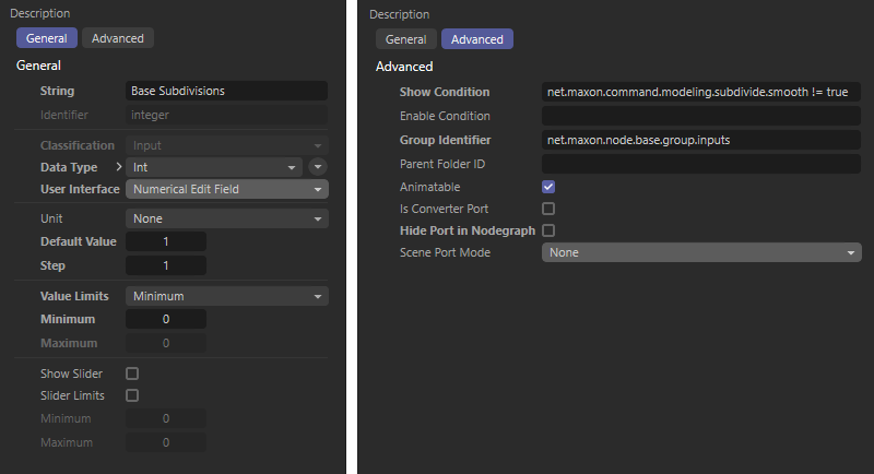 En principe, les trois éléments conviennent à notre objectif, bien que seules des valeurs positives faibles soient généralement utiles pour définir les niveaux de subdivision. Nous apprendrons également comment vérifier la plausibilité des valeurs introduites par l'utilisateur avant qu'elles ne soient utilisées dans le setup, ou comment les limiter automatiquement, si on le souhaite.
