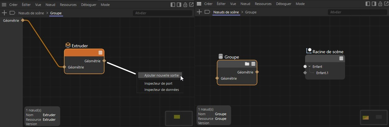 À gauche, une entrée IO Géométrie a d'abord été glissée du navigateur de ressources vers le groupe, puis cette nouvelle entrée a été connectée à un nœud d'extrusion. Pour ajouter une sortie correspondante au groupe, faites glisser et déposez la sortie Géométrie du nœud, puis sélectionnez Ajouter une nouvelle sortie. À droite, vous pouvez voir le groupe complété par les ports.