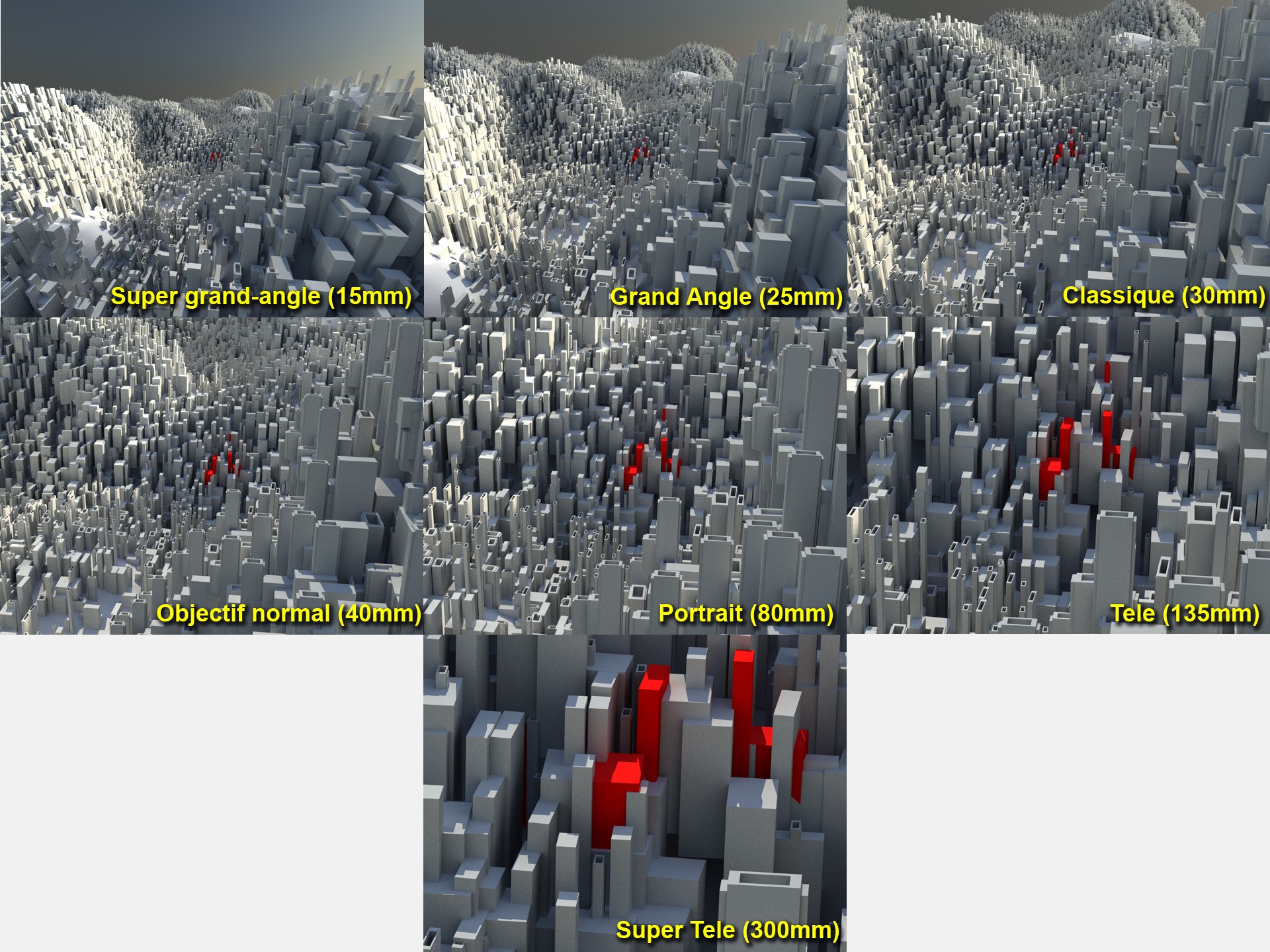 Ce qui suit concerne la profondeur de champ (Moteur de Rendu Physique) : plus la longueur focale est grande, plus la profondeur de champ (zone en direction de la vue mise au point) est petite et inversement. Voir aussi.Profondeur de champ.