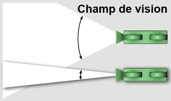 Caméras depuis le haut: angle de champ (horizontal) grand et petit.