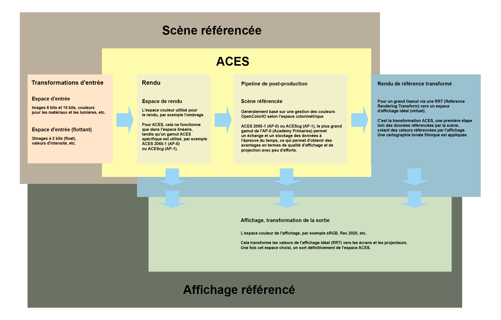Le workflow en Scène Référencée (Scene Referred), qui fait partie de la philosophie ACES, ne modifie que ce qui fait partie de la sortie finale et limite toutes les modifications qui ne sont pas liées à la cible. Dans le cas d'un long pipeline, cela évite de devoir passer par de nombreuses sections différentes liées à l'affichage. Chaque modification apportée à l'espace couleur, même si elles sont basées sur des valeurs de virgule flottante et sont normalement sans perte, changera le comportement des outils utilisés dans le pipeline, même pour une simple commande de flou.