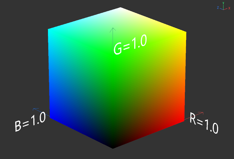 Visualisation d'un espace de couleur RVB simple tel que supporté par de nombreux dispositifs d'affichage. La valeur maximale pour les parties de couleur rouge, verte et bleue sera appliquée ici le long des axes X, Y et Z. Par conséquent, un cube contenant un mélange de toutes ces couleurs primaires sera créé. Les valeurs de couleurs visibles par l'œil humain dépassent en partie de loin les couleurs de ce cube.