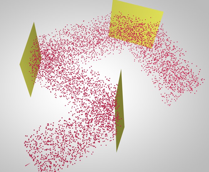 Un objet Déviation vous permet de changer la direction de particules. Vous pouvez en utiliser cinq pour créer une table de billard réaliste, par exemple (un pour la surface et quatre pour les rebonds), l’émetteur générant uniquement une particule (la balle) qui rebondit contre les bandes sans quitter la table.