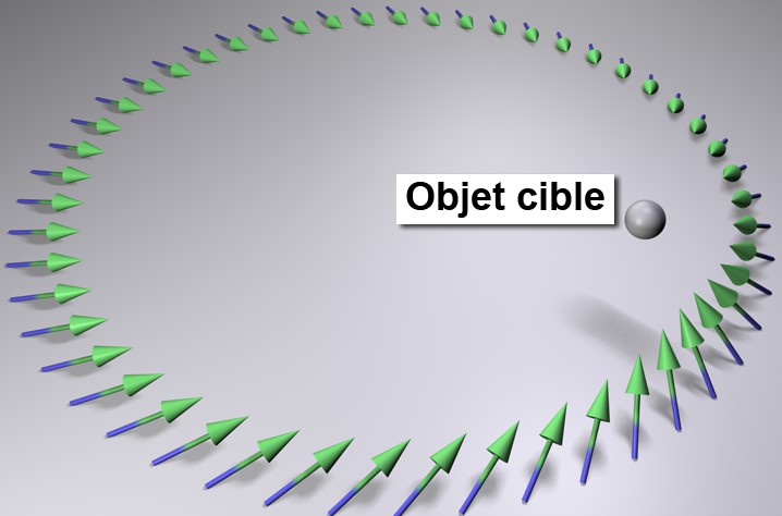 Les clones sont orientés vers l’objet cible. Pour cet exemple, nous avons activé l’option Utiliser le Tangage.