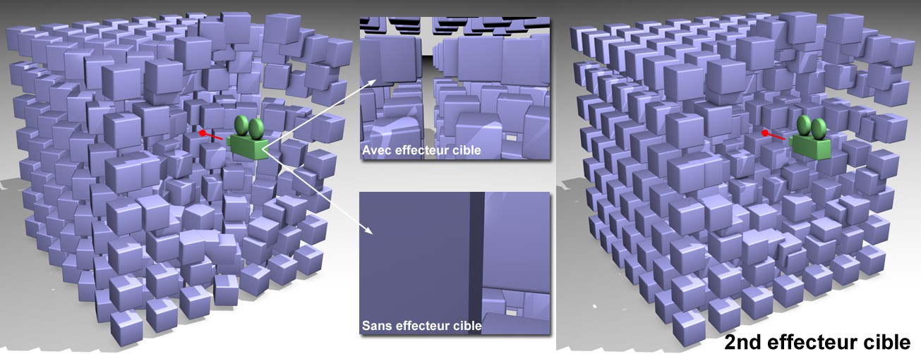 Si vous n'aimez pas l'orientation des clones individuels, qui se tournent vers la caméra, vous pouvez utiliser un deuxième Effecteur Cible pour affecter le groupe de clones (à droite de l'image ci-dessus), qui peut par exemple être ciblé vers un objet distant. Ce deuxième Effecteur Cible doit ensuite être positionné second dans la liste d'Effecteurs. Les clones éviteront ensuite la caméra mais ne se tourneront pas pour faire face à la caméra car le second effecteur (dont l'effet sera appliqué après le premier effecteur) dictera leur rotation.