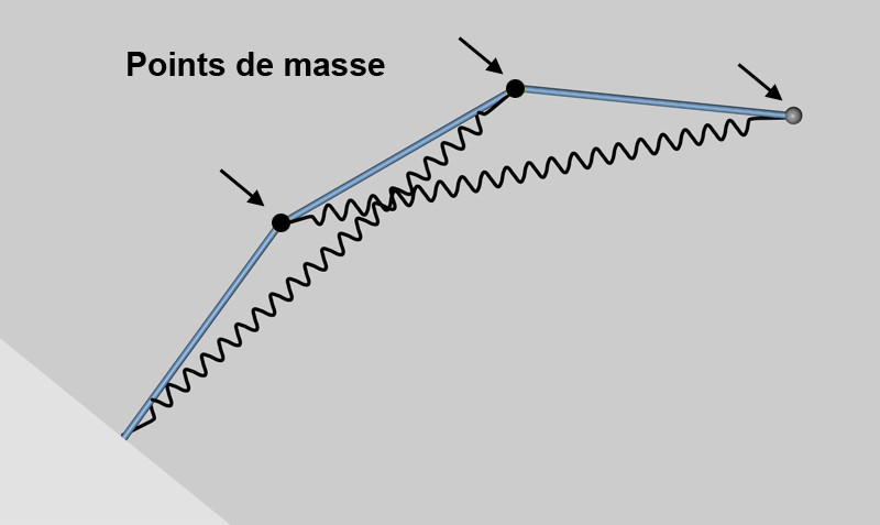 - Les ressorts compris entre chaque point de masse (qui ne peuvent pas varier). La masse des guides est concentrée dans les points de masse, dont l’effet est visible dans les différents mouvements des ressorts.