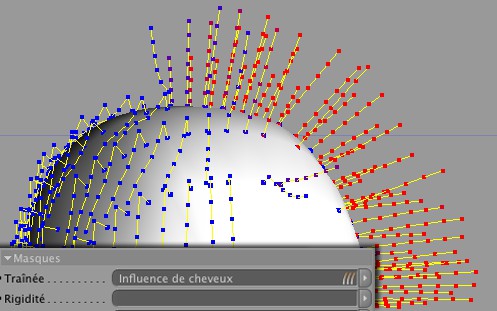 Ci-dessous, les guides de la partie droite de la tête ont été affectés d’une intensité maximum (en rouge). L’option Très rigide est activée, avec une Rigidité de 100%. La propriété Points d’ancrage de cheveux placée dans le champ Rigidité assure que les cheveux les moins rigides (en bleu) tombent, tandis que les cheveux les plus rigides (en rouge) restent complètement droits.