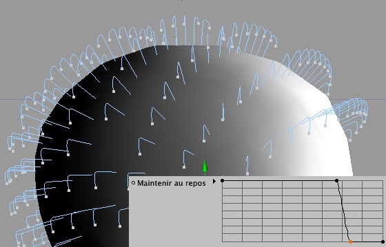 Supposons que vous avez déjà créé des guides et des cheveux : cliquez sur le bouton d’avance rapide dans la palette temporelle. Les guides tombent sous l’influence de la gravité appliquée. Rien de plus simple!