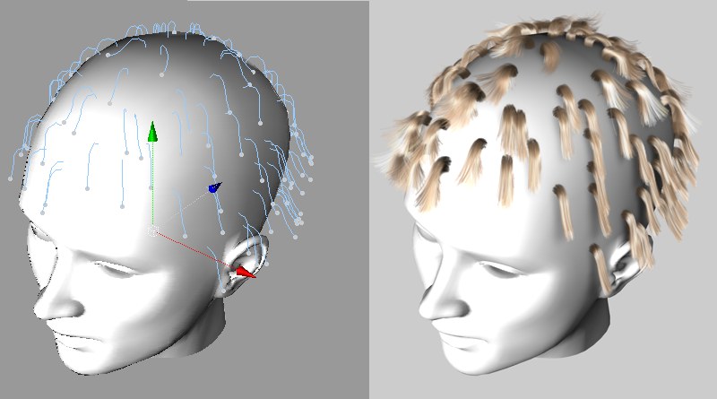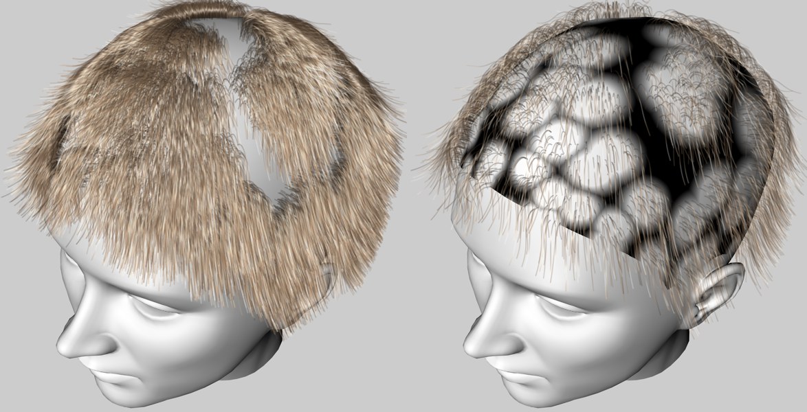 Perte de cheveux partielle. A droite : la texture (avec une matière Voronoï) a été projetée sur la tête. Les cheveux ont été rendus plus fins, ce qui a pour effet de rendre la texture visible.