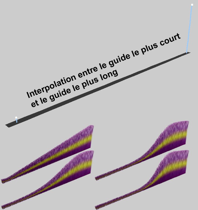 Chaque type d’interpolation applique son propre type d’atténuation à chaque guide. Cet effet est illustré sur l’image ci-dessus, pour laquelle les cheveux ont été interpolés entre un guide très court et un guide très long. Imaginez ces interpolations sur toute une surface et vous aurez une bonne idée du fonctionnement de chaque interpolation.