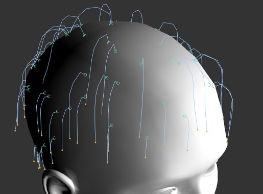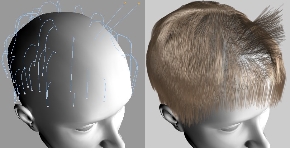 Les guides sont également essentiels pour les dynamiques de cheveux : les dynamiques de cheveux déplacent les guides entre lesquels les cheveux sont interpolés (vous pouvez également faire en sorte que les dynamiques affectent chaque cheveu, mais cela demande une puissance de calcul considérable).