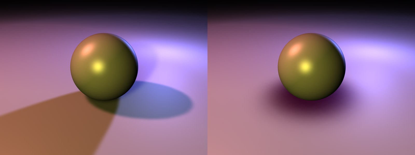 A gauche, la scène a été éclairée de façon optimale avec trois sources de lumière. Toutefois, l’ombre portée contraste avec l’harmonie de la scène. A droite, nous avons placé une source de lumière supplémentaire définie comme Projecteur d’ombres directement au-dessus de la sphère, qui projette maintenant une ombre correcte. Les ombres des trois autres sources de lumière ont été automatiquement désactivées.
