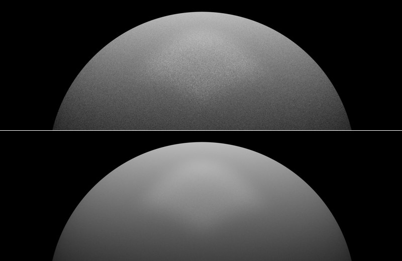 Vous devriez également augmenter la valeur si la dispersion de la lumière n’est pas uniforme (ou lorsque l’option Ajouter du grain (plus lent) est activée). Cette dispersion non uniforme de la lumière se produit particulièrement avec les lumières de surface écrêtant les objets et utilisant des fonctions comme Inverse ou Carré inverse.