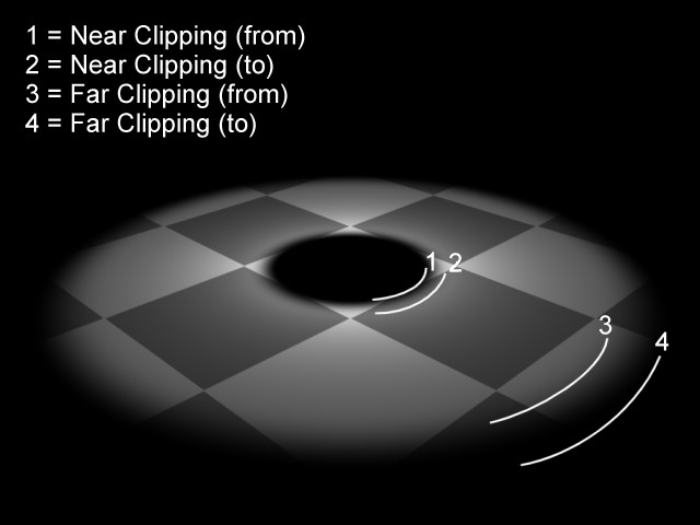 L’Ecrêtage distant peut être utilisé pour couper abruptement l’illumination de la source de lumière. Pour utiliser l’Ecrêtage distant, vous avez là aussi besoin de deux valeurs. Cette fois, les valeurs De et à délimitent le début de l’atténuation et l’endroit ou la lumière disparaît complètement. Là aussi, plus la différence entre ces deux valeurs est importante, plus la transition est douce.