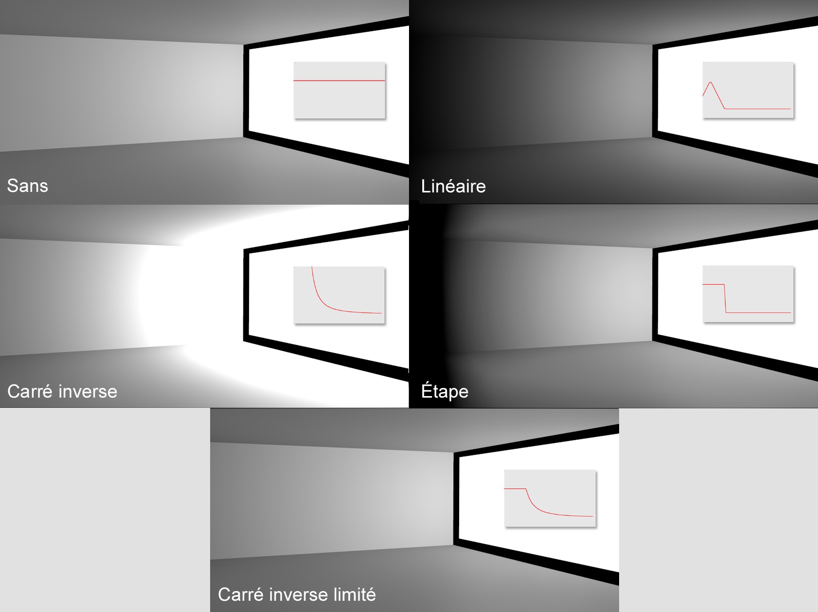 Dans les exemples ci-dessous, vous pouvez voir les différents types d’atténuation pour une lumière de surface. Les petits graphes de fonction indiquent l’intensité de la lumière par rapport à la distance à partir de la source de lumière. Les fluctuations du graphe correspondent aux valeurs de Rayon/Décroissance.