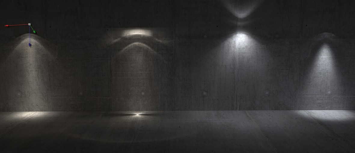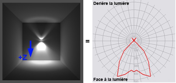 En utilisant le format IES (Illuminating Engineering Society), suffixe: *.ies), il est possible de faire se comporter des sources de lumière comme le font de véritables lumières. Si vous regardez précisément l'image ci-dessus, vous verrez à quel point la dispersion de lumière peut être complexe. Les sources de lumière sont principalement créées en utilisant un réflecteur spécial qui groupe, disperse et répartit la lumière selon le type d'éclairage autorisé.