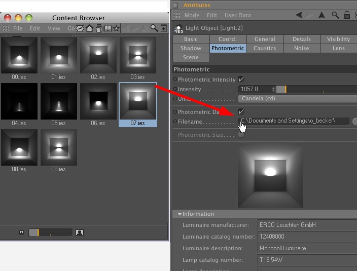 Attention : Le chemin d'accès du fichier IES sera affiché ici mais les données IES seront enregistrées dans le fichier CINEMA 4D. Le fichier IES ne doit donc pas accompagner le fichier CINEMA 4D au moment du transfert des fichiers.