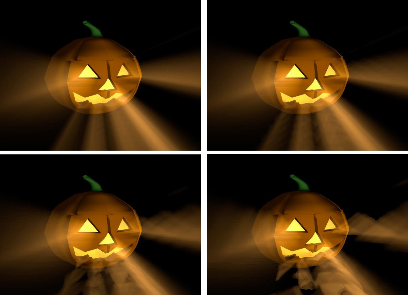 De gauche à droite : Dist. d’échantillon. : 10. Durée du rendu : 105s. La citrouille est parfaite. Dist. d’échantillon. : 20. Durée du rendu: 60s. Vous pouvez apercevoir des artefacts sur les rayons de la bouche et de l’œil droit. Dist. d’échantillon. : 40. Durée du rendu : 35s. Les rayons de lumière visible sont parsemés d’artefacts. Dist. d’échantillon. : 80. Durée du rendu : 23s. L’image est complètement gâchée par les artefacts.