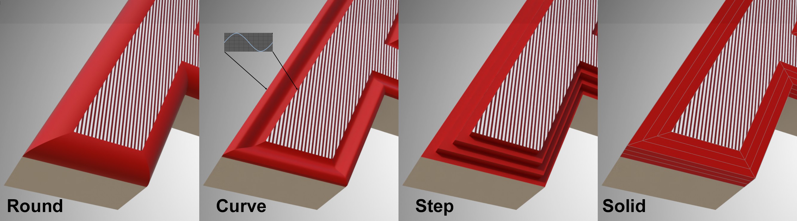 - Solide : Ne crée pas vraiment un biseau, mais plutôt des subdivisions, définies par la valeur Segments, dans la plage de biseaux définie par la valeur Taille, d’où une transition arrondie lorsque l’on utilise un générateur dans un objet Surface de subdivision.