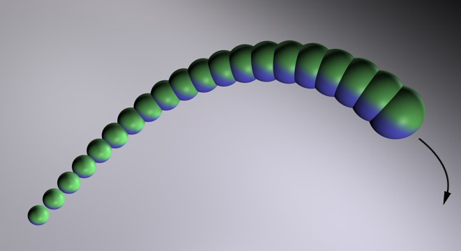 Un objet MoInstance animé peut revenir sur son propre historique en fonction d’un nombre d’images spécifié et recréer des états passés sous forme d’instances. Ces instances sont des clones pouvant être affectés par tout Effecteur (l’Effecteur Etapes est particulièrement efficace). Appuyez sur la touche CTRL pour visualiser l’effet dans la vue sans lire l’animation.