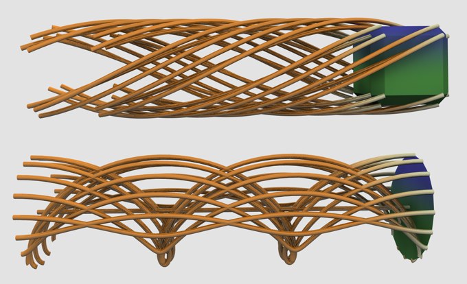 Ici, 2 objets Cloneur sont situés dans un Traceur commun (qui est lui-même situé dans un objet Extrusion contrôlée). Mode "Connecter les éléments" en haut, mode " Connecter tous les objets " en bas.