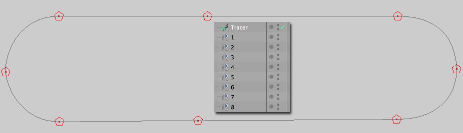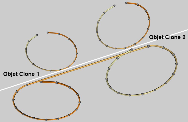 Les objets/particules (les points des objets sont également connectés en fonction du mode Gestion des Cloneurs de l'objet tracé) de différents objets tracés par le même traceur sont connectés par une spline commune, mais avec des segments différents.