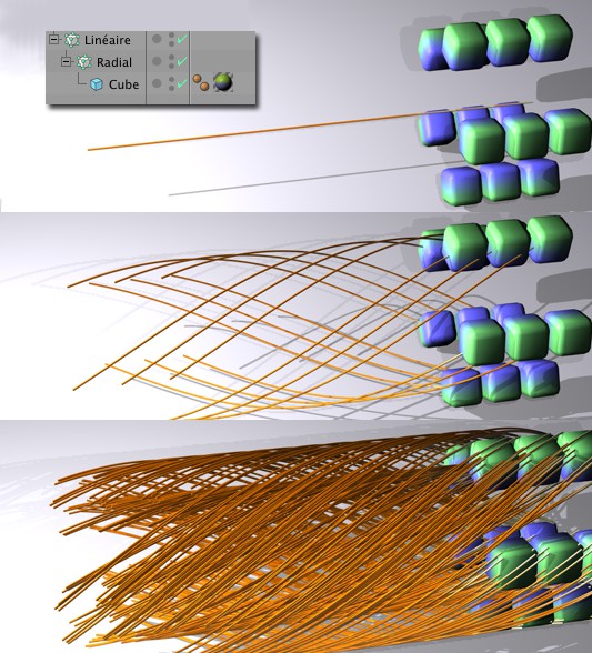 De haut en bas : nœuds uniquement, clones immédiats et clones de clones. L'option Tracer les points est activée dans chaque cas. En haut à gauche : la hiérarchie des objets. Le traceur suit l'objet Cloner linéaire, qui est animé de gauche à droite.