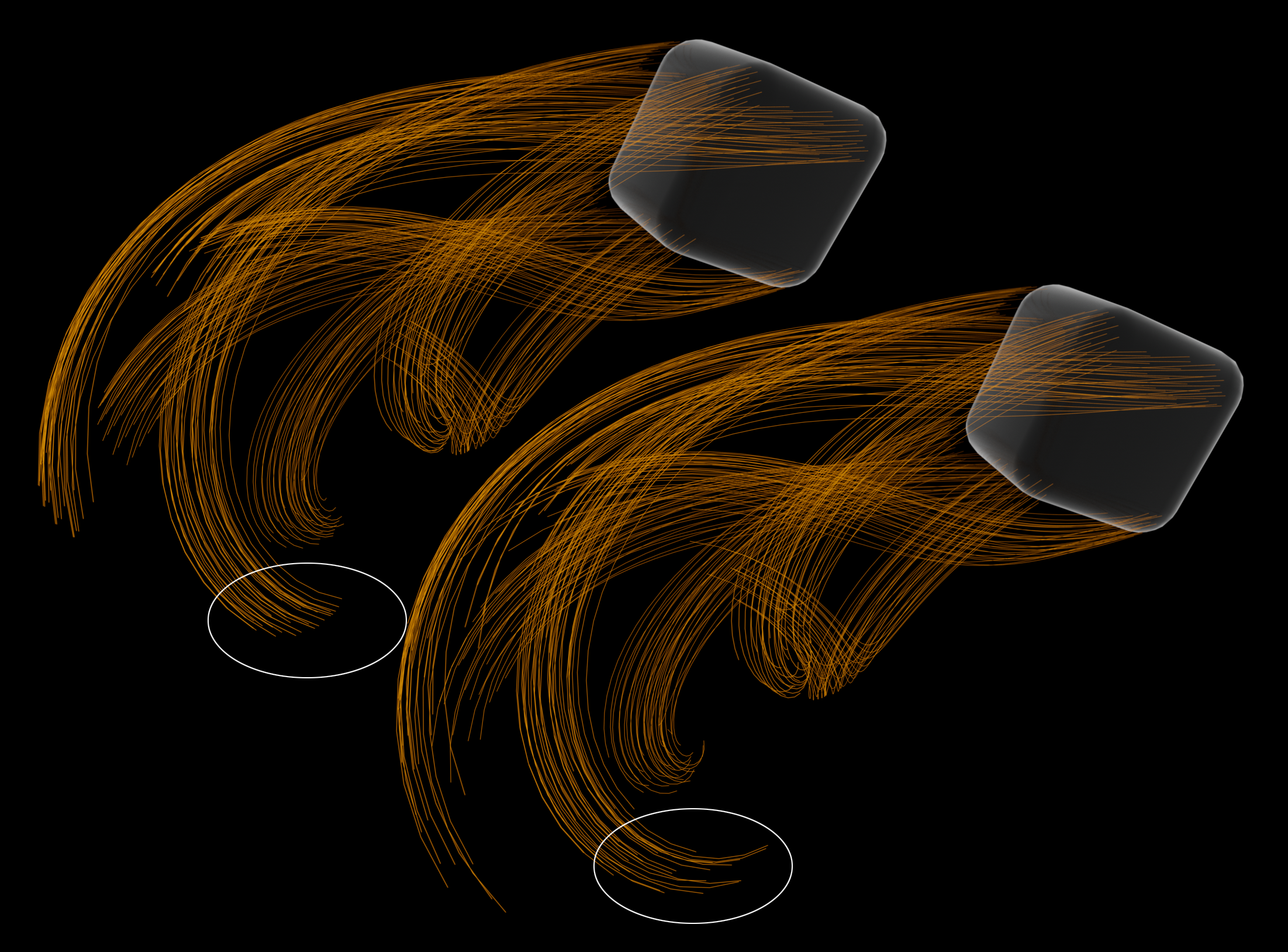 L'objet ou la particule en mouvement entraîne une traînée spline derrière lui. Vous spécifiez la longueur de cette séquence en images d'animation. Le paramètre Quantité correspondant est affiché sous le menu de sélection.