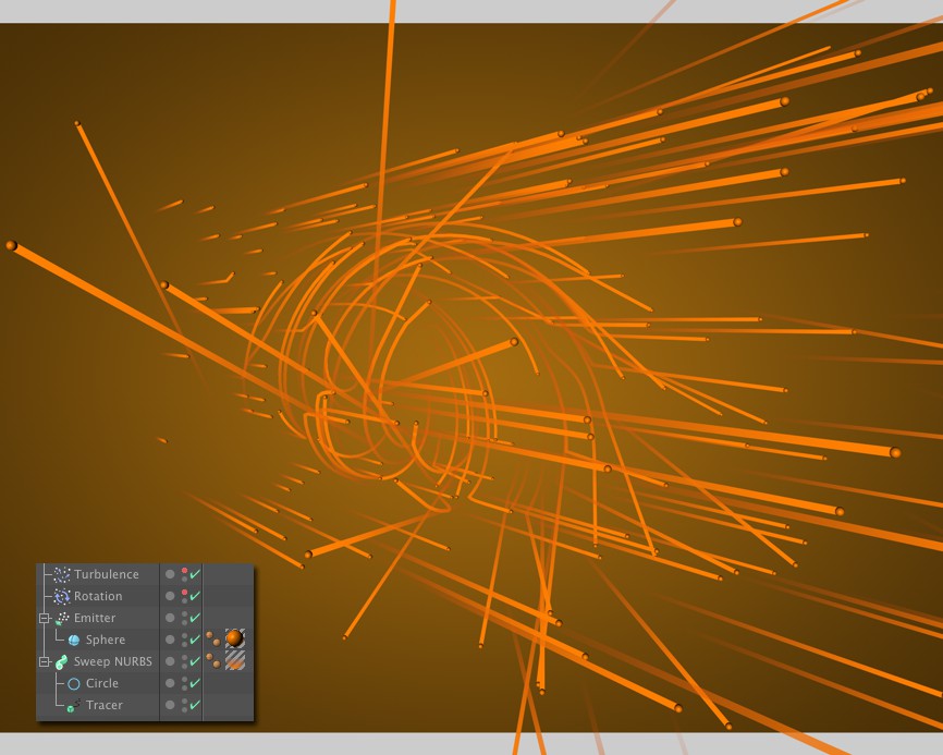 Le Traceur trace le mouvement de particules ou de points d’objet et crée des splines à partir de ces trajectoires. L’objet Traceur peut également être converti en splines via la commande Autoriser les modifications du menu Objet du gestionnaire d’objets. Vous pouvez également déplacer l’objet à tracer interactivement dans la vue pour créer des splines.