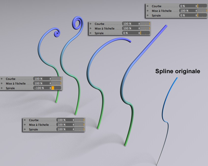 L’effet de ce paramètre peut être mieux vu si la valeur Spirale est réglée sur 0%. Une valeur de 0% poussera la MoSpline au-delà de ses limites dans une ligne droite. Une augmentation de la valeur Spirale en augmentera la quantité en conséquence.